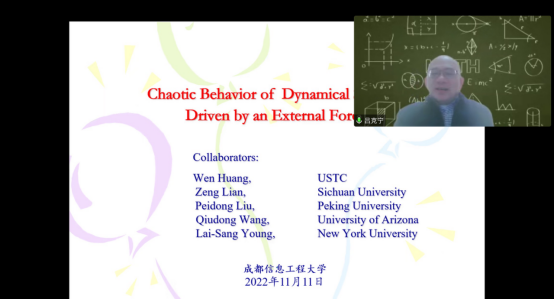 吕克宁教授报告题目是Chaotic Behavior of Dynamical Systems Driven by an External Forcing. 吕克宁教授首先介绍了具有三种不同外力条件的微分方程模型,又以天气预报的数学模型为例引出问题。接着介绍了Sinai-Ruelle-Bowen测度、动力学熵以及有限维动力系统的相关工作,最后总结了混沌与SRB测度之间的联系。吕克宁教授的学术报告深入浅出,简明扼要,生动形象,深受老师和学生们的欢迎。
