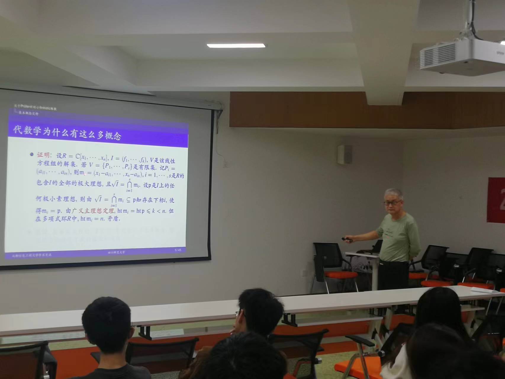 王芳贵教授首先从日常学习出发阐述了环的概念以及研究环的两类基本方法,从回忆线性空间的定义又自然而然地引出了模的概念,即环上的线性空间,为了考察任意一个模与投射模的差距,产生了同调维数(投射维数)的概念。由线性代数对线性方程组的求解自然推演到求解复数域上的高次方程组,阐释了新工具和新方法产生的必要性,从而回答了同学们一直困惑的关于代数学为什么有这么多概念的问题。