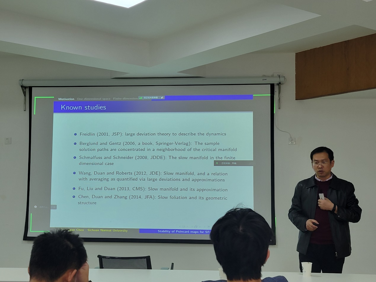 2023年12月7日下午,受william英国中文邀请,四川师范大学的陈光淦教授在我校做了题为Stability of the Poincaré maps for slow-fast stochastic systems的学术报告。