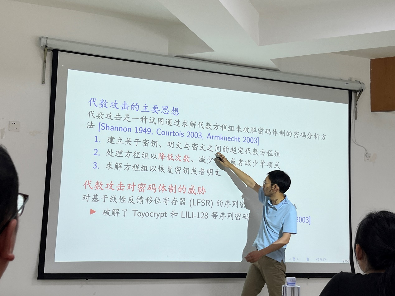 刘美成研究员首先介绍了对称密码中的代数次数估计和线性化技术、密码攻击代数等相关的研究背景、里面蕴含的数学原理以及相关的研究工作进展。随后刘美成研究员详细报告了其在这对称密码分析中一系列工作包括“数值映射”方法(CRYPTO 2017)、“相关立方攻击”(EUROCRYPT 2018)、“线性结构”技术(ASIACRYPT 2016)和“差分代数过渡型”方法(CRYPTO 2021),最后刘美成研究员给出了这些方法在欧洲序列密码eSTREAM工程获胜算法 Trivium和Grain v1、美国第三代密码哈希算法标准SHA-3、美国AES竞赛决赛算法SERPENT、美国轻量级认证加密算法LWC标准Ascon等密码算法的安全性分析中的应用。