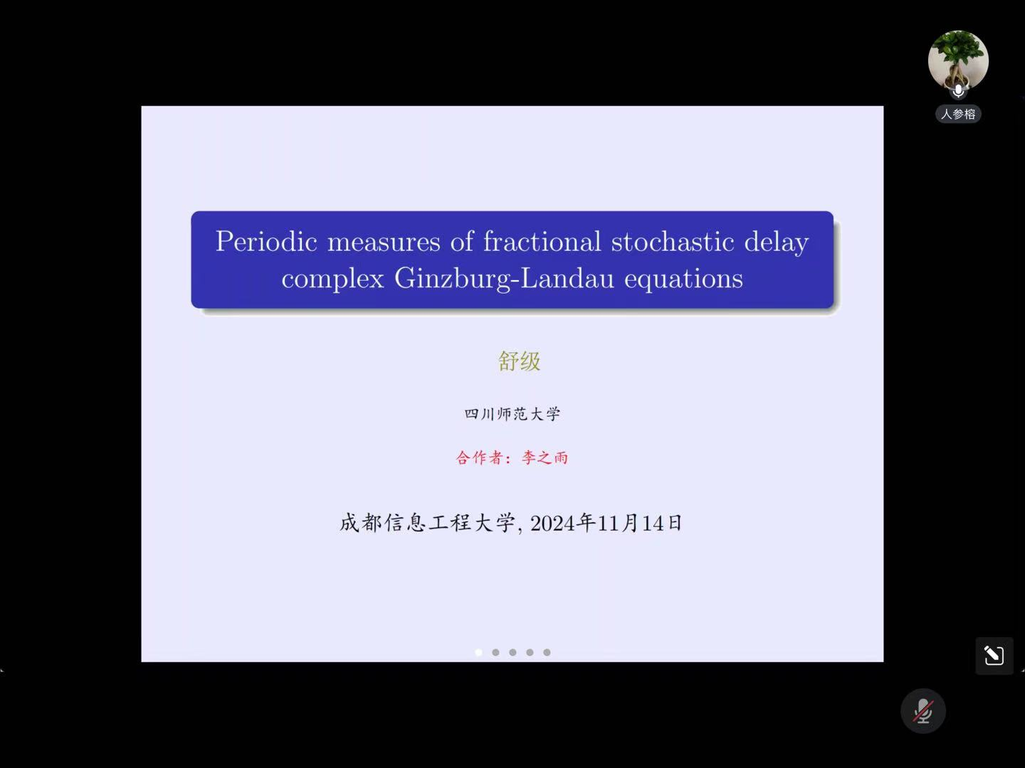 11月14日晚上,应william英国中文邀请,四川师范大学舒级教授做了题为:“Periodic measures of fractional stochastic delay complex Ginzburg-Landau equations”的线上讲座,讲座由学院院长周钰谦教授主持,部分教师和研究生在线上参加了本次讲座。