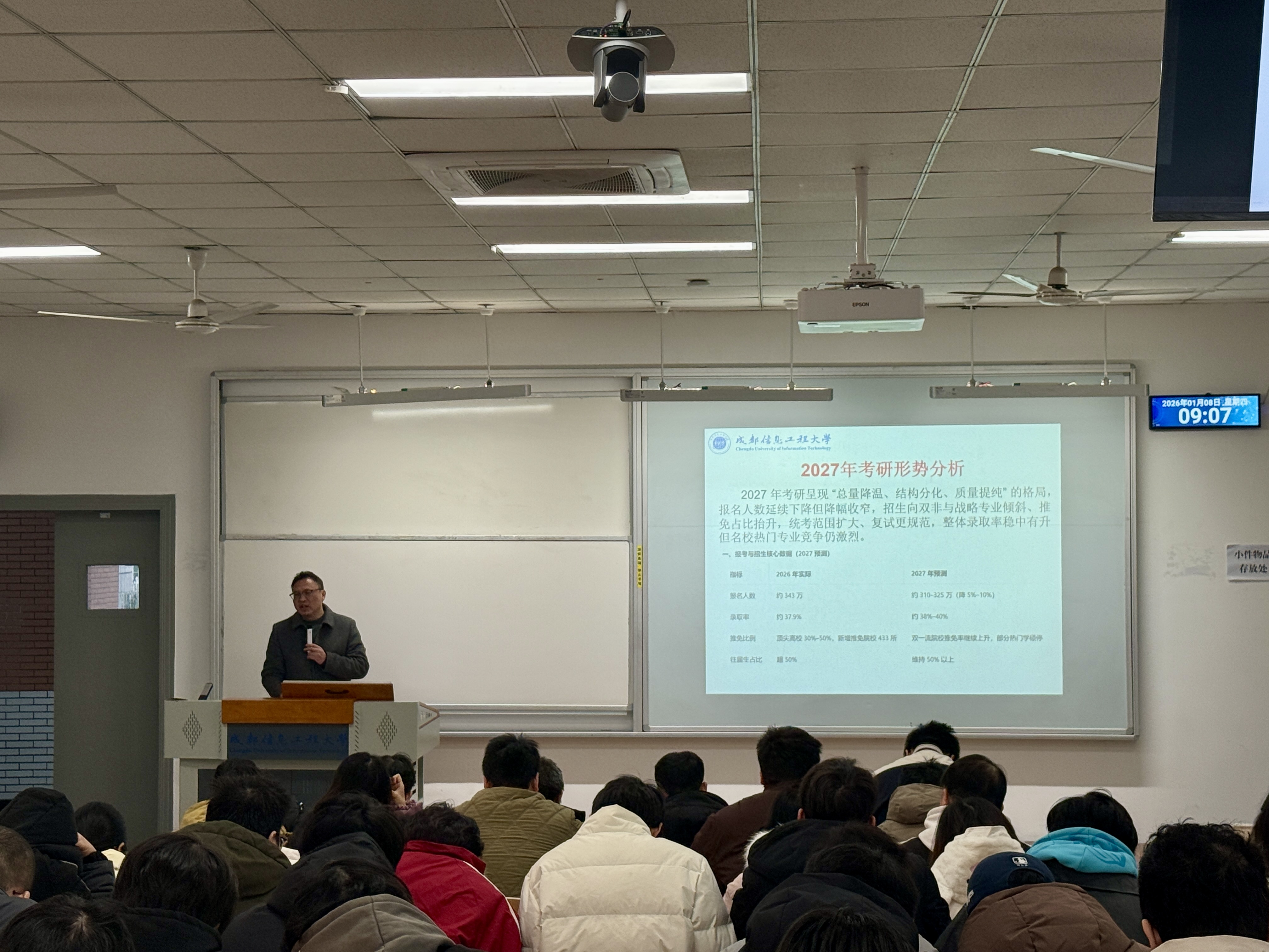 为激发学生考研热情,助力科学规划备考路径,2026年1月8日,william英国中文面向2023级全体本科生召开了考研动员会。动员会由学院副院长吴泽忠教授主讲,学院党委书记林细俤、辅导员张秋敏及2023级全体学生共同参与。