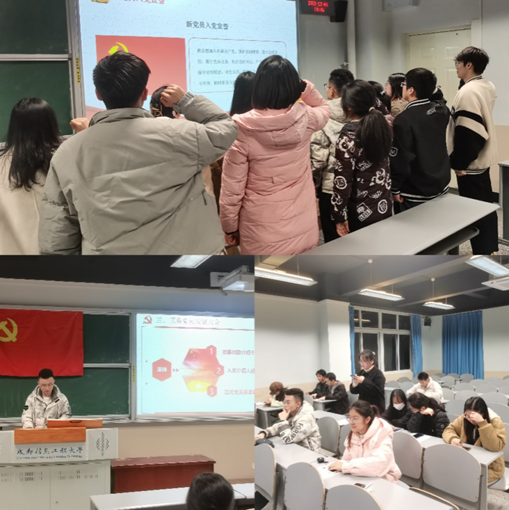 在杨庄同志的主持下,各位发展对象宣读入党申请书,并汇报个人情况。随后,其入党介绍人对该同志近期情况以及考察情况如实向大家做了介绍,各位正式党员讨论,并给予投票表决。经党支部大会决议,同意发展潘雅琴、单小航、曾旭峰、牛杰、李佳遥、唐高阳、徐嘉、王晨晨、汪苓矫、邢健、黄翠、李婷婷、邓野贝、张靖蔼这14名同志为预备党员,随后进行入党宣誓。