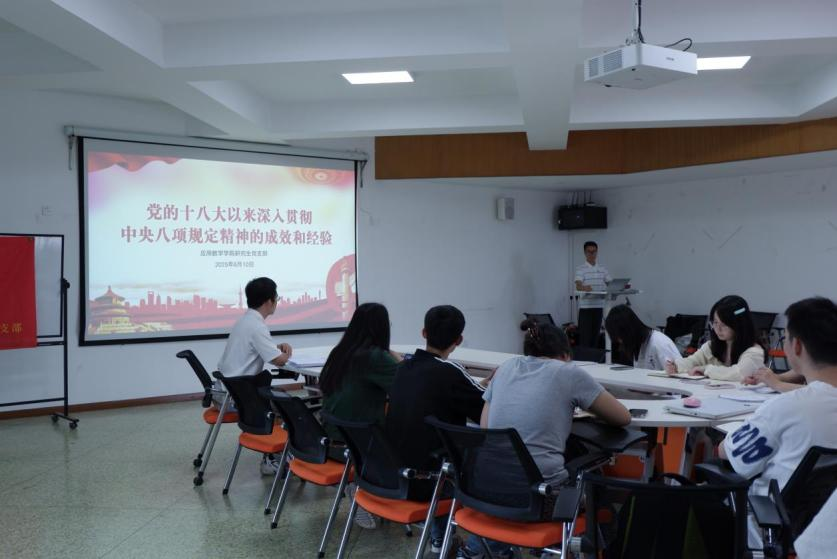 数学与应用数学系党支部6月10日在信息楼6楼大会议室召开支部大会,围绕深入贯彻中央八项规定精神学习教育,支部书记廖开方强调,制定实施中央八项规定是我们党在新时代的徙木立信之举,全体党员同志要清醒认识违规吃喝问题的政治危害,要不断增强严格落实中央八项规定精神的政治自觉、思想自觉、行动自觉。会上,廖开方带领全体党员加强学习了党的六项纪律,包括政治纪律、组织纪律、廉洁纪律、群众纪律、工作纪律、生活纪律。6月12日支部开展深入贯彻中央八项规定精神学习教育警示教育专题学习,廖开方结合相关警示教育案例,包括违规吃喝、违规收送礼品礼金、借调研和培训等名义公款旅游等问题开展警示学习教育。会议还传达学习习近平总书记在贵州、云南、河南等地考察时的重要讲话精神。7月4日,学院院长周钰谦以《深入贯彻中央八项规定精神学习教育》为题,为数学与应用数学系党支部开展专题党课,周钰谦深入浅出解读中央八项规定及其实施细则,结合自身学习与工作实践,阐述厉行勤俭节约、反对奢侈浪费和奢靡之风、廉洁从政、工作作风务实的精神实质,并通过案例剖析,教育党员知敬畏、存戒惧、守底线。