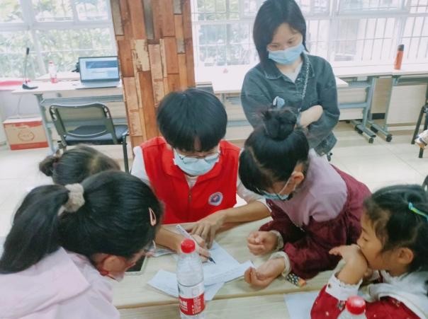 活动一开始由志愿者给小朋友表演魔术“预见未来”,通过魔术激发小朋友对数学的兴趣,小朋友都在积极参与乐意配合志愿者完成魔术。魔术活跃氛围后是由每5个小朋友组成的小组挑选题目合作完成三道与数学有关的小问题,根据每组正确率进行积分。数学在不少人看来是艰难枯燥的,每个小组的小朋友虽然年龄不同知识水平不同,但拿到题目之后都兴致勃勃地讨论起来,现场的志愿者也在为小朋友们耐心讲解,活动氛围欢悦且自由,小小的房间装下了各种各样的奇思妙想。完成答题后,每道回答正确的题都会请相应的组派小朋友进行讲解,讲解的小朋友勇敢大方,听讲的小朋友也在努力思考别的小组的题目,大家都沉浸在数学思考带来的乐趣里。