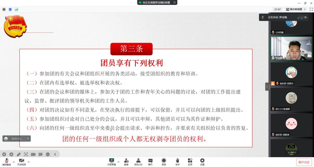 首先,罗佳强带领大家齐唱团歌,并向大家介绍了团歌使用规范。其次,罗佳强详细地介绍了团的基本知识和团建设必须贯彻的基本要求。随后,依次介绍团的组织制度、团的各级组织、团的干部以及团的纪律,让同学们更加深入了解中国共产主义青年团。最后,以微电影《重逢》结束了本次团课。