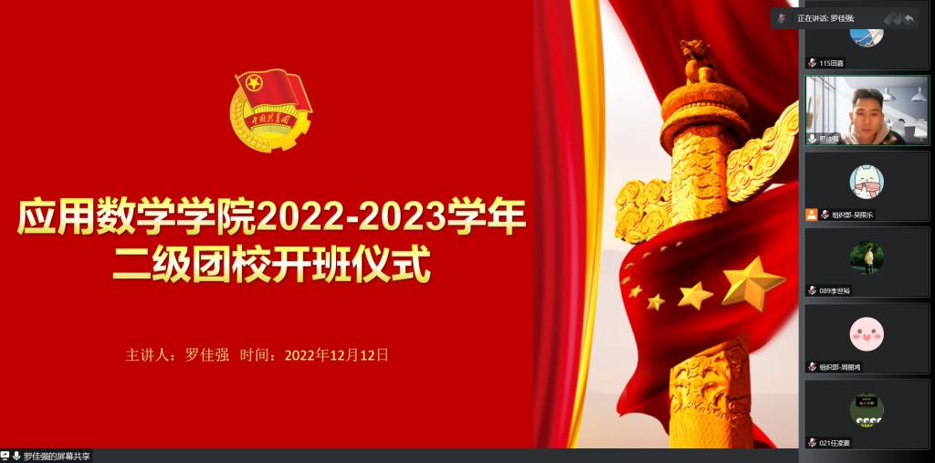 为了充分发挥团组织教育青年的功能,进一步加大对团员青年、团学干部的培养教育力度,我院于2022年12月12日19:30在腾讯会议上开展2022-2023学年二级团校开班仪式暨第一堂团课。我院2022级各支部成员、学院组织部全体成员、入团积极分子参加。本次团课由学院团委副书记罗佳强主讲。