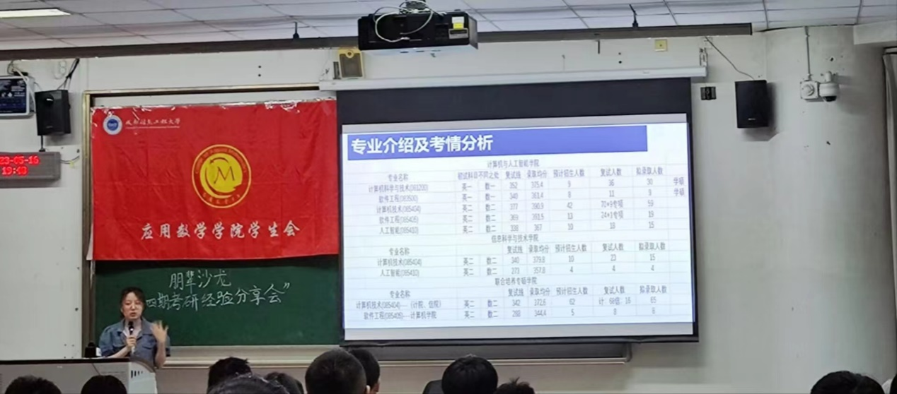 第四位分享考研经验的是施成学长,他成功考取了成都理工大学的应用统计专业。他分享了自己考试的方法以及挑选院校和专业的经历,认为在选择专业时要结合自身兴趣和未来就业前景,同时强调在搜集相关资料时要全面,要充分了解专业的核心课程和教学团队等信息。