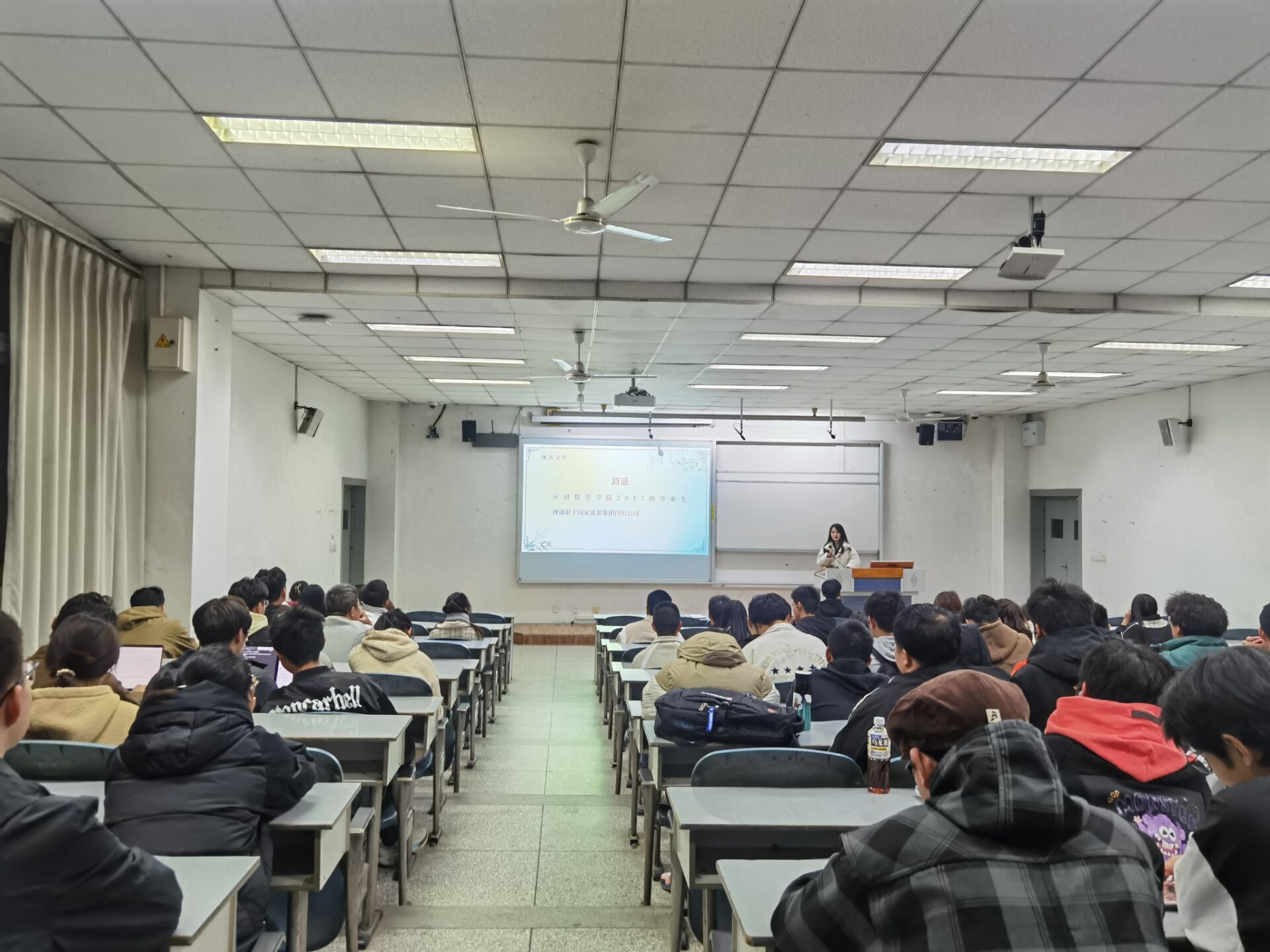 为强化学生专业认知,帮助学生做好学业和职业规划,提升学生学习热情,应用数学学院于2023年12月12日晚在1101召开校友分享会。此次分享会邀请了2名校友主讲,辅导员曾凤娇及2023级全体新生参加。