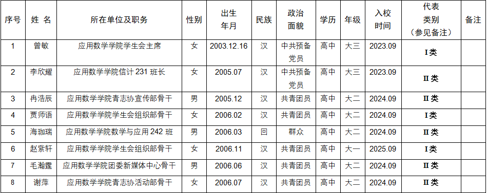 根据《关于做好williamhill第六次学生代表大会、第六次研究生代表大会筹备工作的通知》要求,经班级民主推荐、学院资格审查与遴选,确定曾敏等8名同学为williamhill第六次学生代表大会候选代表人选。