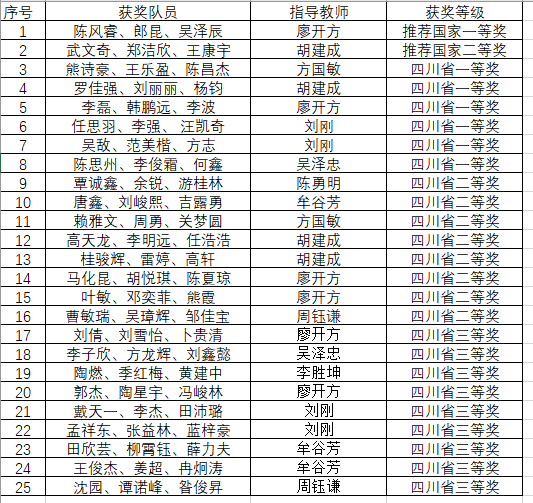 日前,“高教社杯”全国大学生数学建模竞赛四川赛区成绩公布,我校共计25支队伍获奖,其中1支推荐国家一等奖;1支推荐国家二等奖;6支获省一等奖;8支获省二等奖;9支获省三等奖。详细获奖名单如下: