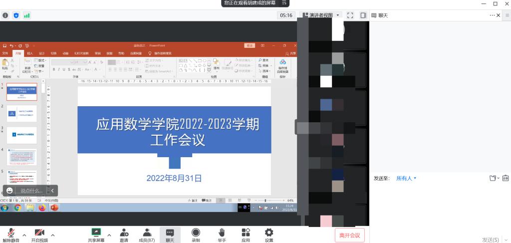 周钰谦做了会议的总结讲话。周钰谦先向各位老师介绍了学院的年度总体工作进展情况,目前学院的各项工作任务都在顺利进行,人才引进取得了较好的成效,科研任务和教学任务有了阶段性成果,创收工作有序推进。下半年面临最大的工作就是两个评估工作,即本科教育教学审核评估和学位授权点专项评估工作。最后,他向全院教师发出了“两保障、一遵从”的号召,请各位老师务必保障学院两个评估工作正常运行,保障学院的核心任务顺利进行,一定要遵从学校的防疫工作安排。