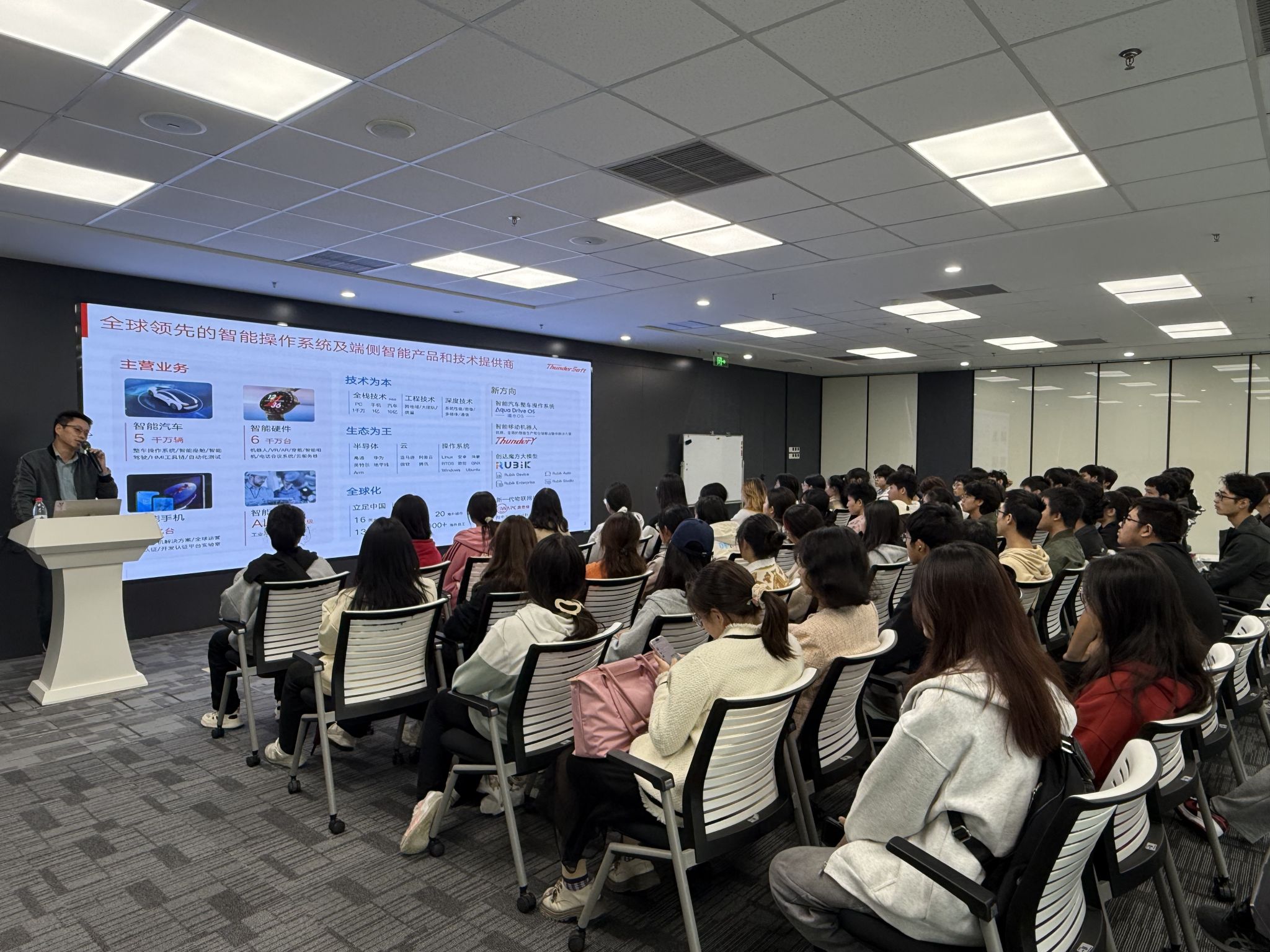活动伊始,中科创达代表首先对新生们表示了热烈的欢迎,接着中科创达成都研发总经理王浩详细介绍了公司的发展历程、业务领域以及在智能操作系统方面的成就。中科创达在智能汽车、物联网、人工智能等多个领域都拥有深厚的技术积累和创新实力,为新生们展现了一个充满机遇与挑战的科技世界。