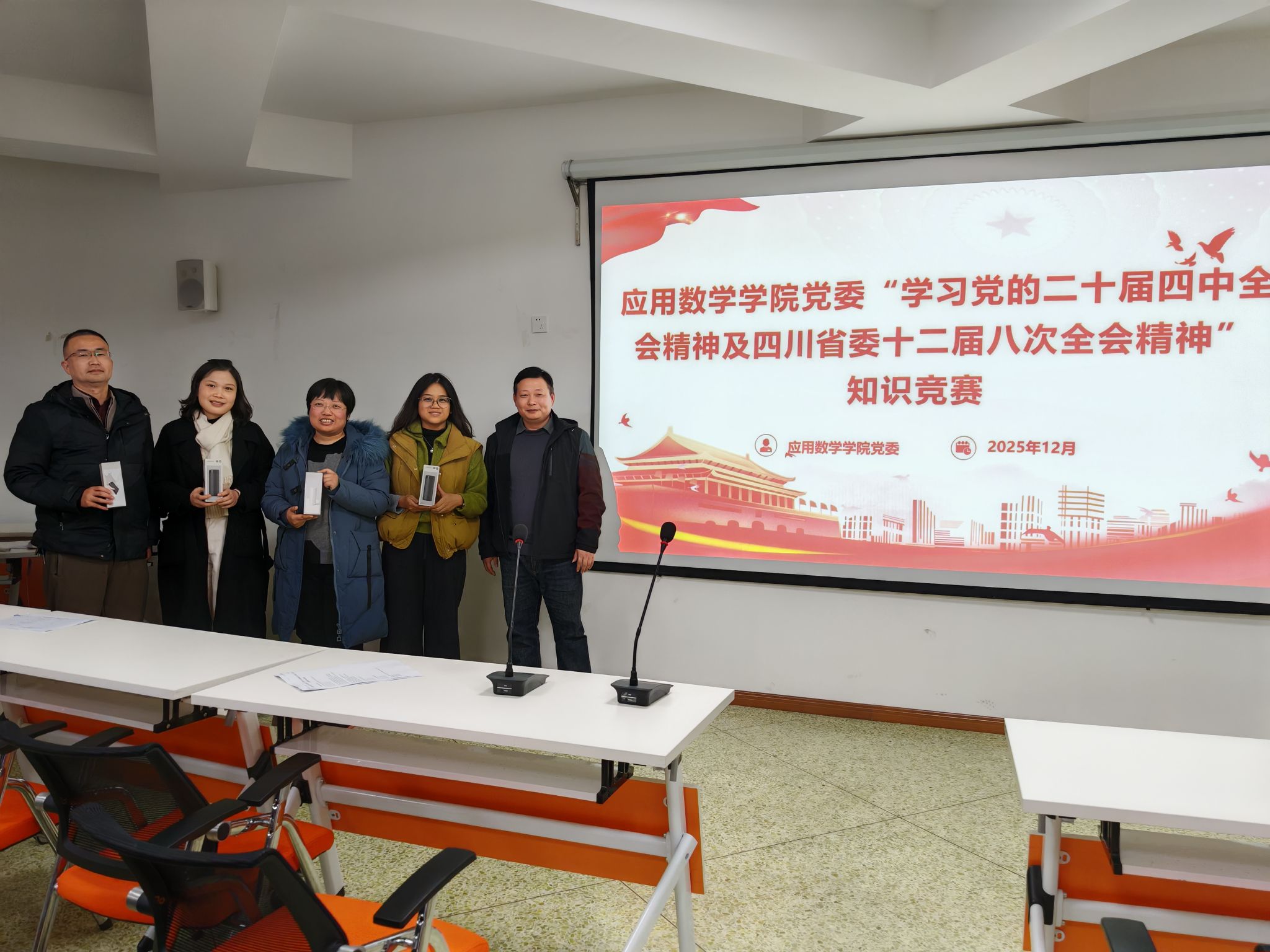 经过答题比拼,活动评选出各等级奖项,学院党委书记林细俤为获奖教师颁发奖品。此次竞赛不仅让教师党员进一步加深了对党的二十届四中全会精神和省委十二届八次全会精神的理解与把握,更激发了全员学习党的创新理论的热情,营造出“比学赶超、全员参与”的浓厚学习氛围。下一步,william英国中文党委将持续推动党的创新理论学习走深走实,引导广大师生将思想和行动统一到党中央和省委决策部署上来,将学习成果切实转化为助力学科建设提质、人才培养增效、科研创新突破的实际举措。