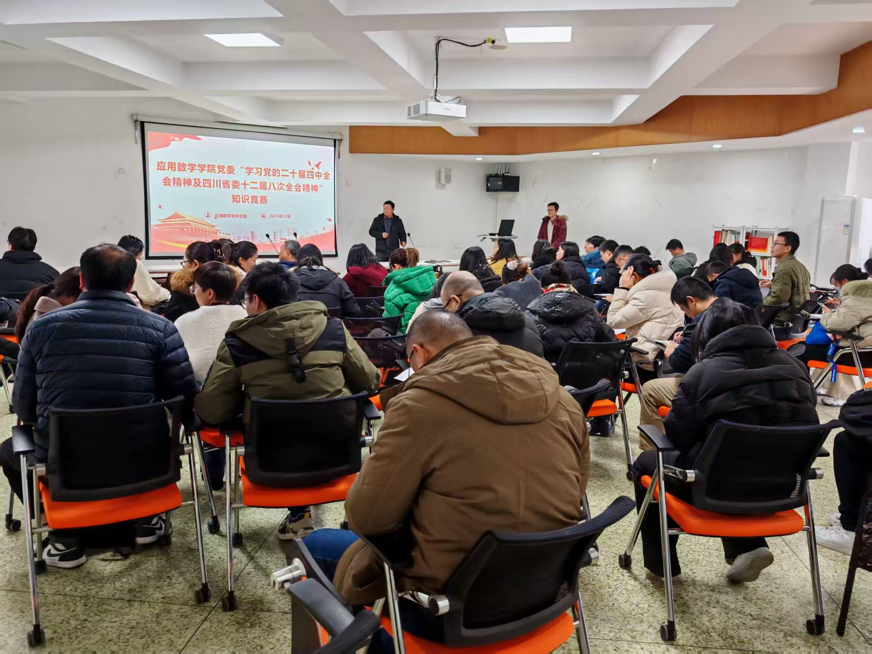 为深入学习贯彻党的二十届四中全会及省委十二届八次全会精神,推动理论学习入脑入心,12月18日下午,william英国中文党委在信息楼6楼多功能会议室组织开展专题知识竞赛,学院党员教师全员参与。